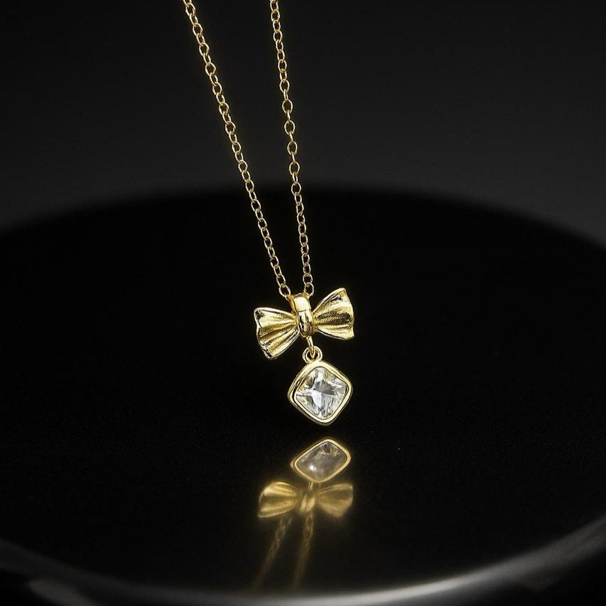 The pendant is bow with dropping stone and lite weight model.Anti tarnish stainless steel hypoallergenic.