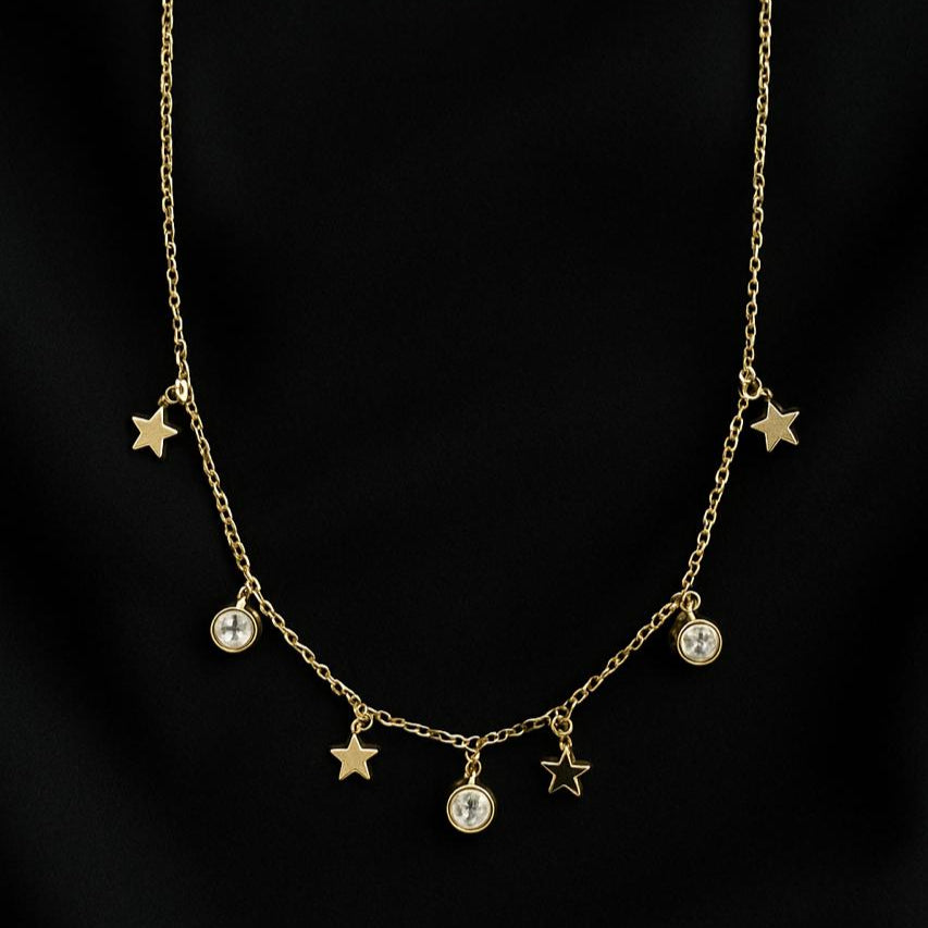 This delicate gold necklace features a fine chain adorned with alternating charms of open star motifs and round bezel-set stones.